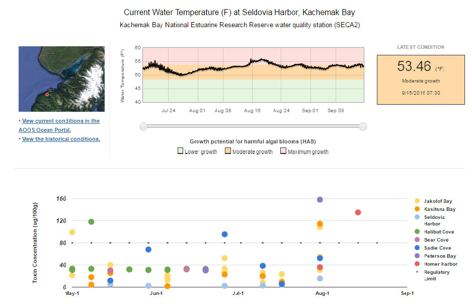 Harmful algal blooms (HAB) have long been a threat in some coastal Alaskan communities. As ocean temperatures rise over the next few decades, HABs are expected to occur more frequently. While the State of Alaska regularly tests commercial shellfish toxins, recreational and subsistence shellfish are not tested. Access to information about environmental conditions influencing HABs is important for making informed choices about shellfish consumption to reduce the risk of shellfish poisoning.