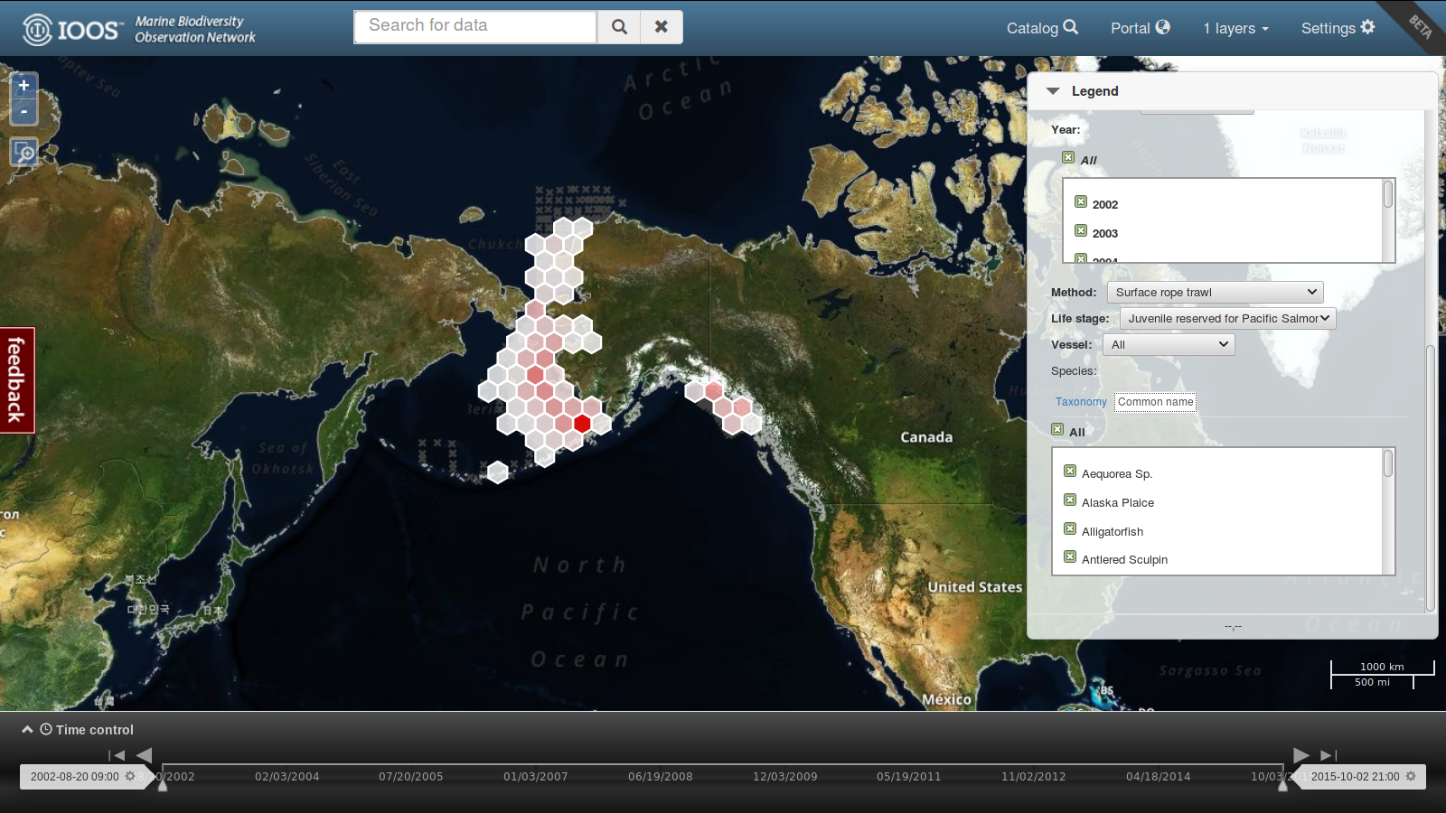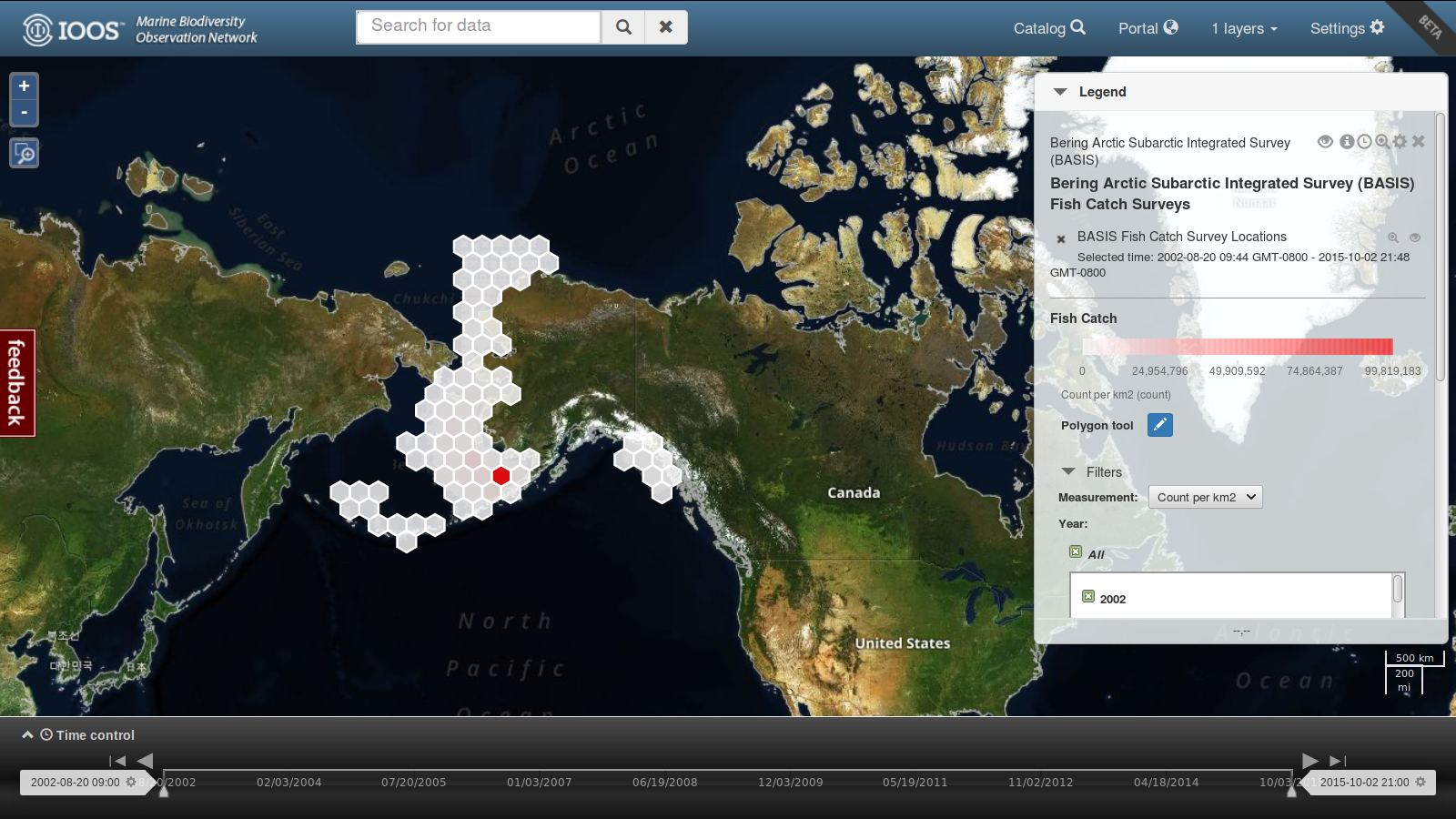 Among the many other datasets available to explore, the MBON portal also features fish catch survey data from the North Pacific Anadromous Fish Commission’s Bering Arctic Subarctic Integrated Survey.