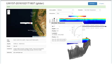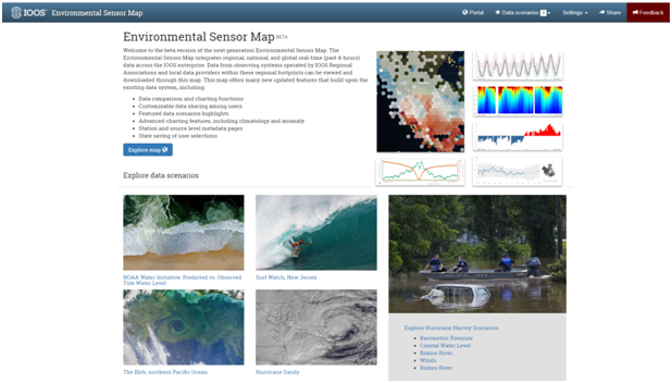 Building on many years of stakeholder feedback, we have been working on a significant overhaul to the shared infrastructure for our partners data portals, including the Integrated Ocean Observing System (IOOS)’s Environmental Sensor Map, the Alaska Ocean Observing System (AOOS)’s Ocean Data Explorer, the Southeast Coastal Ocean Observing Regional Association (SECOORA) Data Portal, the Central and Northern California Ocean Observing System (CeNCOOS) Data Portal, and more. The updated portal gives users access to new features as well as a revamped design allowing for more data services. With this latest release, the map has migrated to a new framework that is more responsive and tailored to viewing long time series from stations, as well as being updated with more advanced discovery and sharing capabilities. The map offers sophisticated charting abilities, including comparisons between data sources, binning by time, and plotting of climatologies and anomalies. A new feature, data scenarios, show user-created compilations of sensor outputs to spotlight environmental events or geographic locations. In a later version, ocean profiling sensors will show depth charts, interpolation via kriging, and 4D interactive charts.