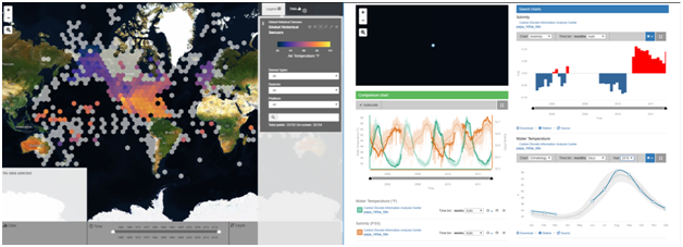 New map interface with palette control (left), and comparison charts between different sensors and parameters (right). Data charts offer user selection of climatology or anomaly views for longer timeseries (>3 years).