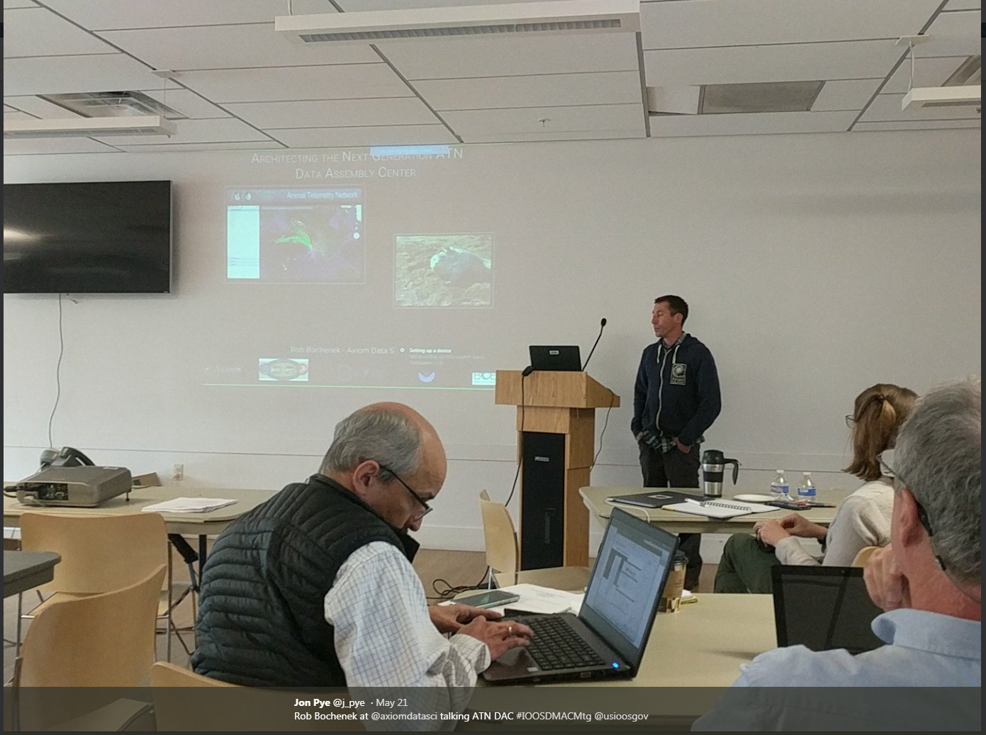 This year’s IOOS Data Management and Communications (DMAC) Meeting took place from May 21-23 at the Silver Spring Civic Center in Silver Spring, Maryland. The meeting was a chance for data managers from all of the different IOOS Regional Associations and other groups to get together and discuss a wide range of topics from data quality control to web analytics. Here Axiom’s Rob Bochenek, Kyle Wilcox, Stacey Buckelew, and Jessica Austin presented on several topics, including the IOOS Environmental Sensor Map , the MBON data portal , the IOOS Animal Telemetry Network’s Data Assembly Center (DAC) , the SECOORA WebCat- Live Cameras and Historic Feeds , and more! The meeting was a great opportunity to share experience and demonstrate new technologies with other data managers and helps foster the already strong IOOS-DMAC community. Visit here for more information about this and past meetings.